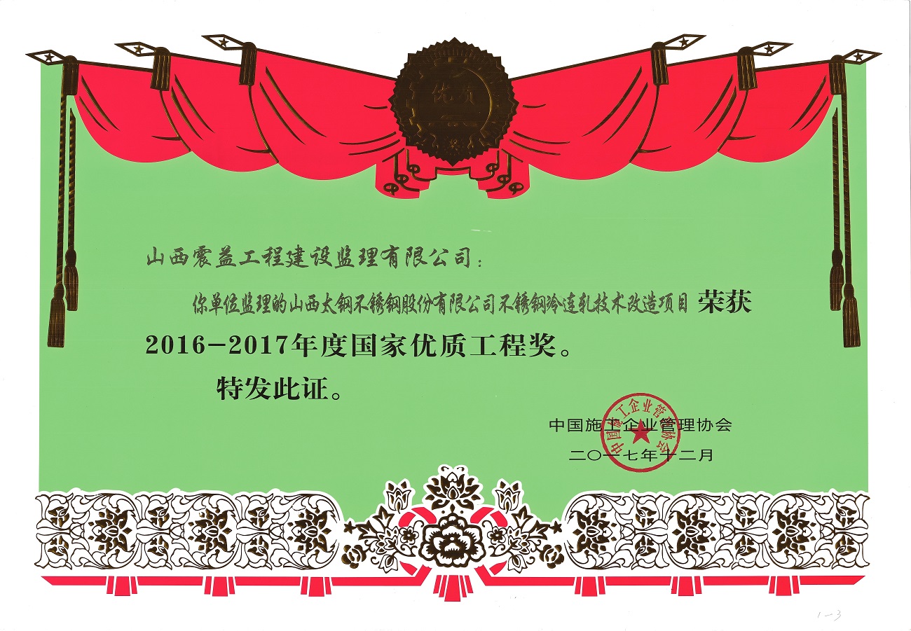 公司先后承擔(dān)了冶金、機(jī)械、電力、礦山、市政、環(huán)保、房屋建筑等工業(yè)及民用建設(shè)大中型工程項(xiàng)目1000余個(gè),足跡遍及國內(nèi)二十多個(gè)省市,在全國各地四千余個(gè)制造廠家進(jìn)行了駐廠設(shè)備監(jiān)理,工程監(jiān)理也立足省內(nèi)輻射全國多個(gè)省區(qū)乃至國外。多年來,我們憑著嚴(yán)格監(jiān)理、優(yōu)質(zhì)服務(wù)的工作作風(fēng)贏得業(yè)主的信任和好評(píng),受監(jiān)工程質(zhì)量合格率均為100%。由我公司監(jiān)理的太鋼7.63m焦?fàn)t(及配套化產(chǎn))工程、450㎡燒結(jié)工程、4350m3高爐工程、400萬噸煉鋼/連鑄工程、2250mm熱軋工程、新不銹鋼冷軋工程、熱軋加熱爐工程、冶煉廢水處理工程、BOC制氧工程、40萬噸及50萬噸不銹鋼冷軋工程、制鐵煉鋼節(jié)能減排660㎡燒結(jié)機(jī)工程、不銹鋼冷軋光亮板結(jié)構(gòu)調(diào)整工程、型材系統(tǒng)改造一期徑鍛機(jī)工程、加工廠礦渣超細(xì)粉二期工程、2250mm熱連軋罩式爐工程、2250mm熱連軋新建鋼卷表面處理線工程、袁家村鐵礦項(xiàng)目、不銹冷連軋技術(shù)改造工程、硅鋼冷連軋技術(shù)改造工程等等多項(xiàng)工程項(xiàng)目均獲得了“冶金工業(yè)優(yōu)質(zhì)工程”獎(jiǎng);日貸清潔生產(chǎn)90噸電爐工程獲山西省“汾水杯”質(zhì)量獎(jiǎng);太原濱河小區(qū)、19宿舍、太鋼2*300MW自備電廠、太原市不銹鋼工業(yè)園區(qū)等工程獲太原市“******文明施工樣板”工地;太鋼不銹2*300MW自備電廠改擴(kuò)建煙筒構(gòu)筑物工程、太鋼2*300MW空冷供熱機(jī)組儲(chǔ)煤筒倉建筑工程、山西太鋼不銹鋼科技冷軋精密帶鋼工程等獲“山西省優(yōu)良工程”;1350 m3高爐、400萬噸煉鋼/連鑄工程獲得******建設(shè)工程“魯班”獎(jiǎng)、不銹冷連軋技術(shù)改造工程獲“******優(yōu)質(zhì)工程獎(jiǎng)”。太鋼150萬噸不銹鋼系統(tǒng)工程同時(shí)獲******“建國60年來經(jīng)典暨精品工程”獎(jiǎng)、“******優(yōu)質(zhì)工程金質(zhì)獎(jiǎng)”、******工程建設(shè)“魯班”獎(jiǎng)三項(xiàng)大獎(jiǎng)。
